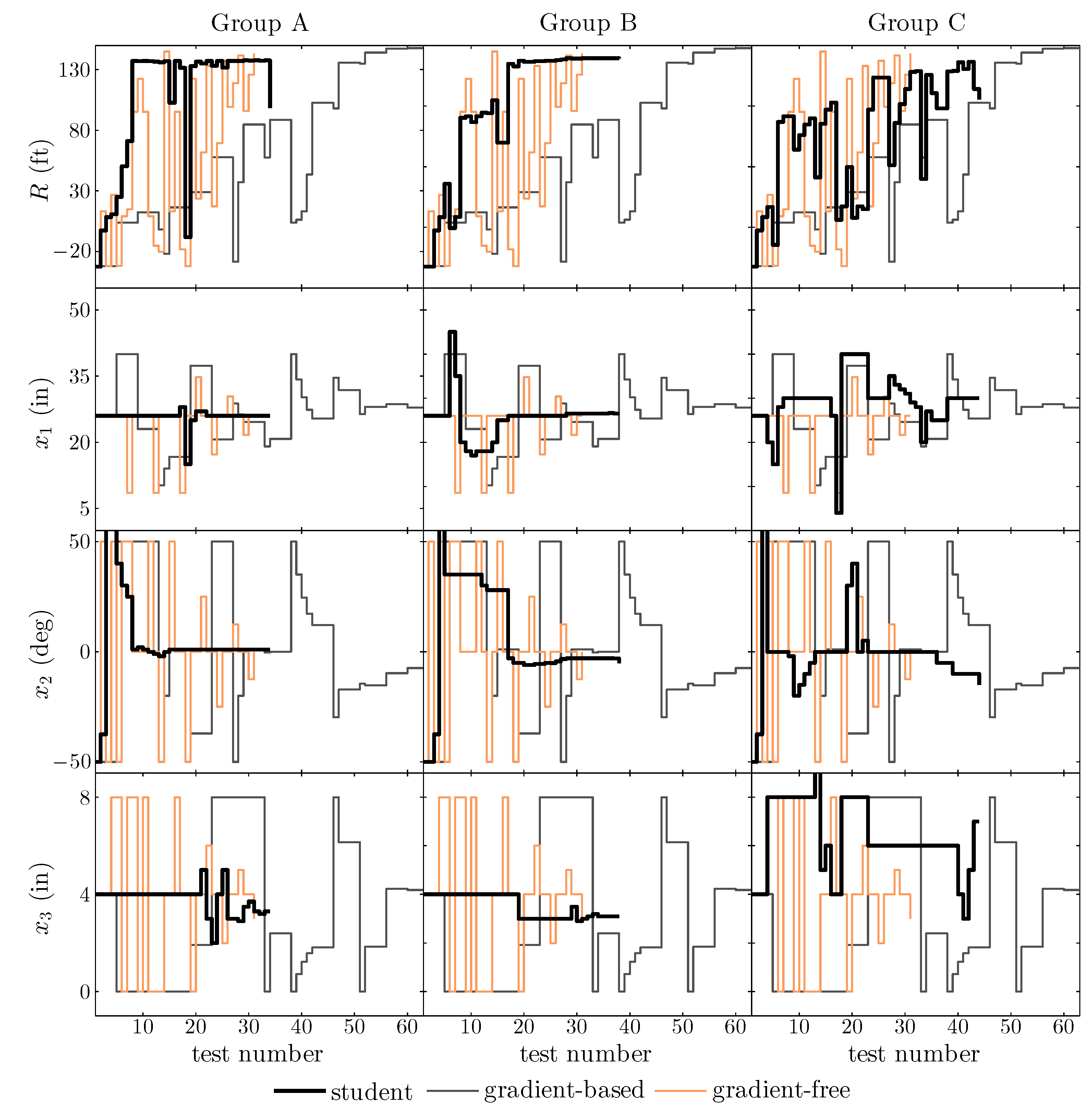 We first note that all groups eventually achieve a design near 130 ft (global optimum is 149 ft) even from a starting point that had a very poor range of −32 ft. Group A seems to understand the trebuchet design immediately with increasing range with every test until arriving near their best design very quickly. Group B had range progress similar to the gradient-based method, with consistently increasing range but with some lower values as well. The Group C test sequence was more chaotic, but still produced a general increase in range. The overall theme between the groups is their ability to greatly outperform the gradient-based methods with a lower number of tests and be on par with the gradient-free approach. This may be due to the students ability to use engineering intuition for physical systems in combination with quantitative analysis (i.e., engineering judgment), as opposed to being limited to quantitative understanding only (as is the case with the optimization algorithms). Optimization algorithms ultimately find better performing designs. It seems that, when student groups find a design that performs reasonably well, their design improvement stagnates.