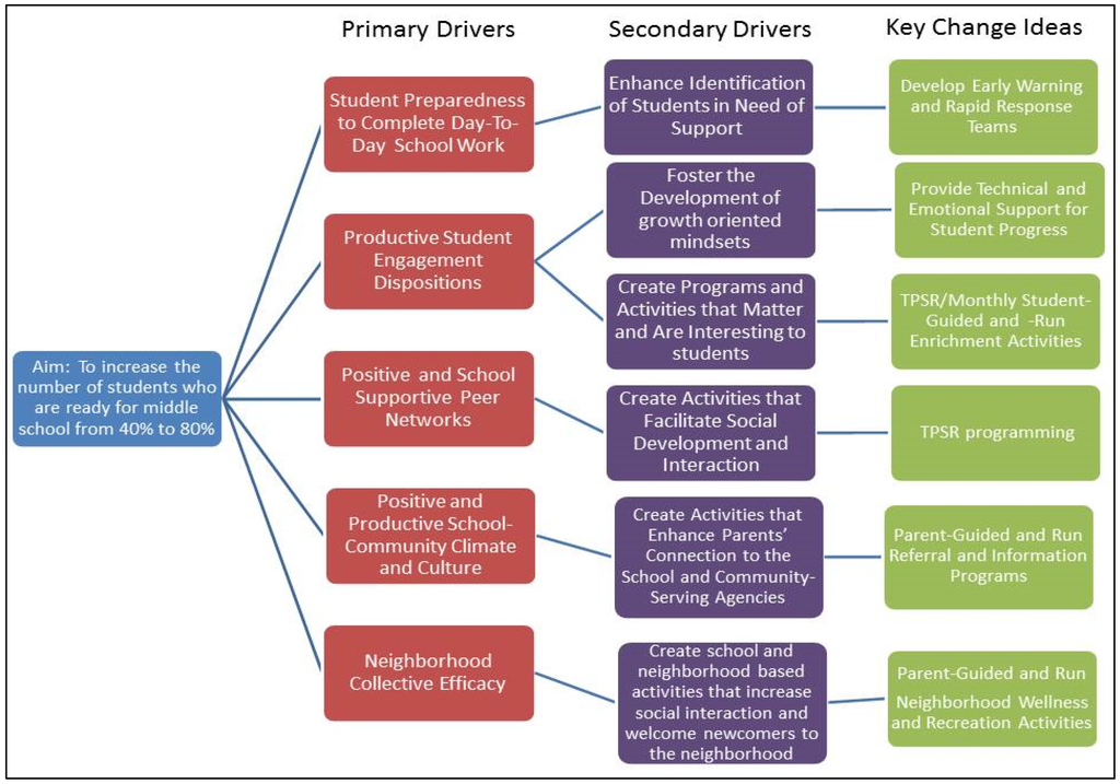 As depicted in our driver diagram, the primary aim of the TOPS effort is to increase the percent of students who leave elementary school with the social, psychological, and cognitive competencies/skills they need to successfully make the transition to middle school. Currently, the school’s test scores indicate that about 40% of the student body is achieving this benchmark. Our aim is to increase this percentage to 80% over a five year period. Our theory is that by doubling the percentage of “middle school ready” students we can create the conditions for more enduring and successful learning experiences for students in middle school, high school, and beyond.