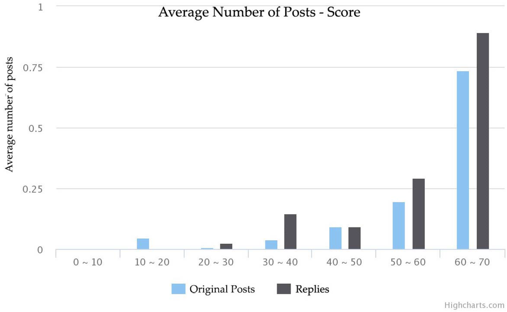 That is in line with an analysis conducted in a set of large Stanford University MOOCs offered on Coursera. Anderson et al. observed that the activity level and the average grade of the student making the initial post is substantially lower than that of the students making subsequent posts. This suggests that “better students are helping out others in the class by joining the threads they initiate” [13].