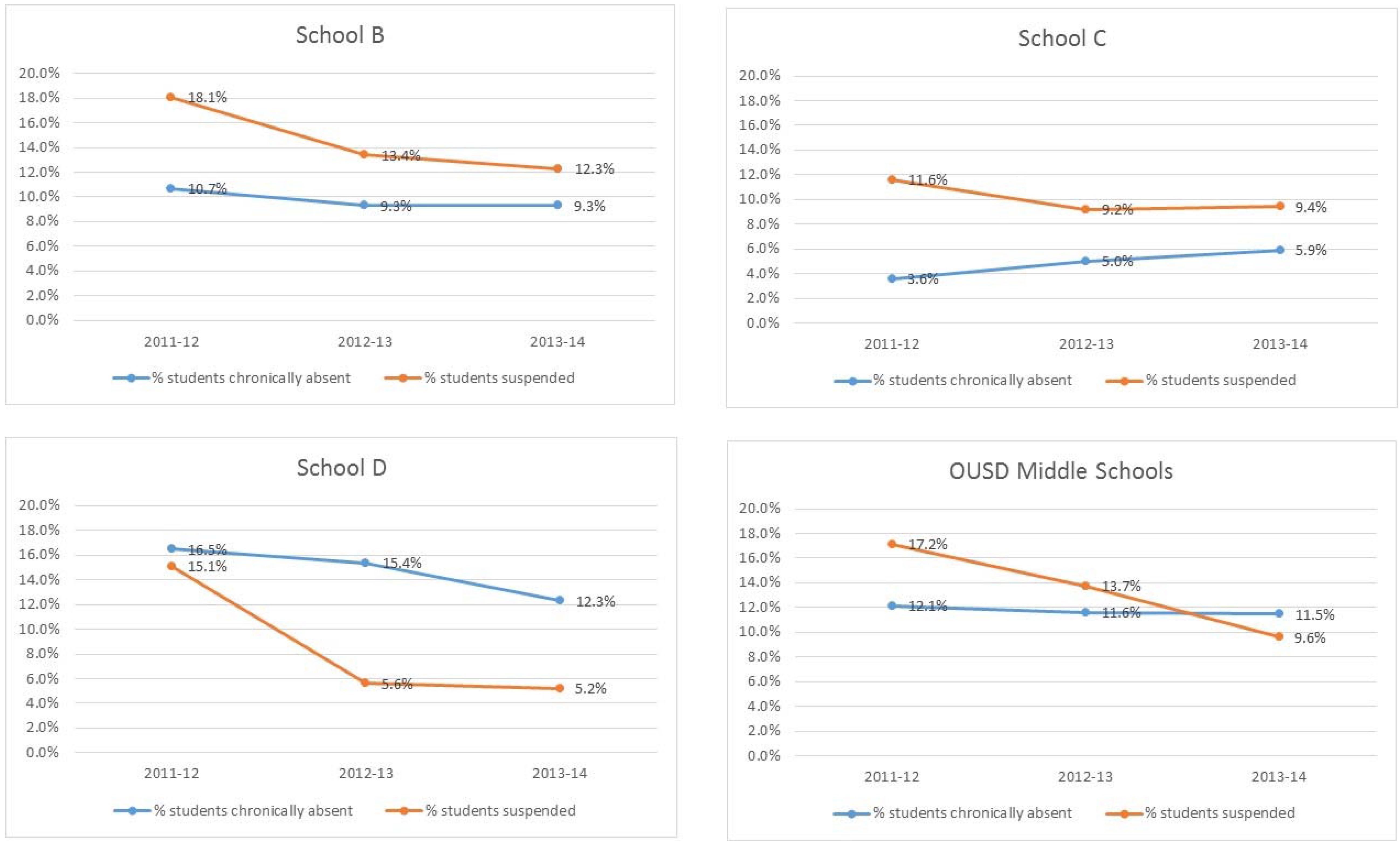 In addition to interviews with key staff, we did analyze OUSD administrative data as an additional source of information regarding the relationship between community school implementation and student outcomes anticipated to be influenced by community school activities. We examined school-level trends in leading indicators of academic engagement and performance related to student behavior and attendance. Figure 2 reports three-year trends in chronic absenteeism and student suspension rates for the three schools in our study sample that serve middle school students along with middle school district-wide averages. We examine middle school grades here because three of our five sample schools serve this population. Further, this grade level allows for comparisons between community schools and traditional schools, as there are very few community schools at the elementary school level, and few traditional schools at the high school level, making comparisons between community and traditional schools difficult. All three of these schools demonstrate reductions in the percentage of students suspended, consistent with district-wide trends. Further, in these schools, chronic absence either decreased or remained below the district average. Overall, these figures suggest trends in the desired direction although further statistical analysis is required to explore these relationships before making any causal inferences.
