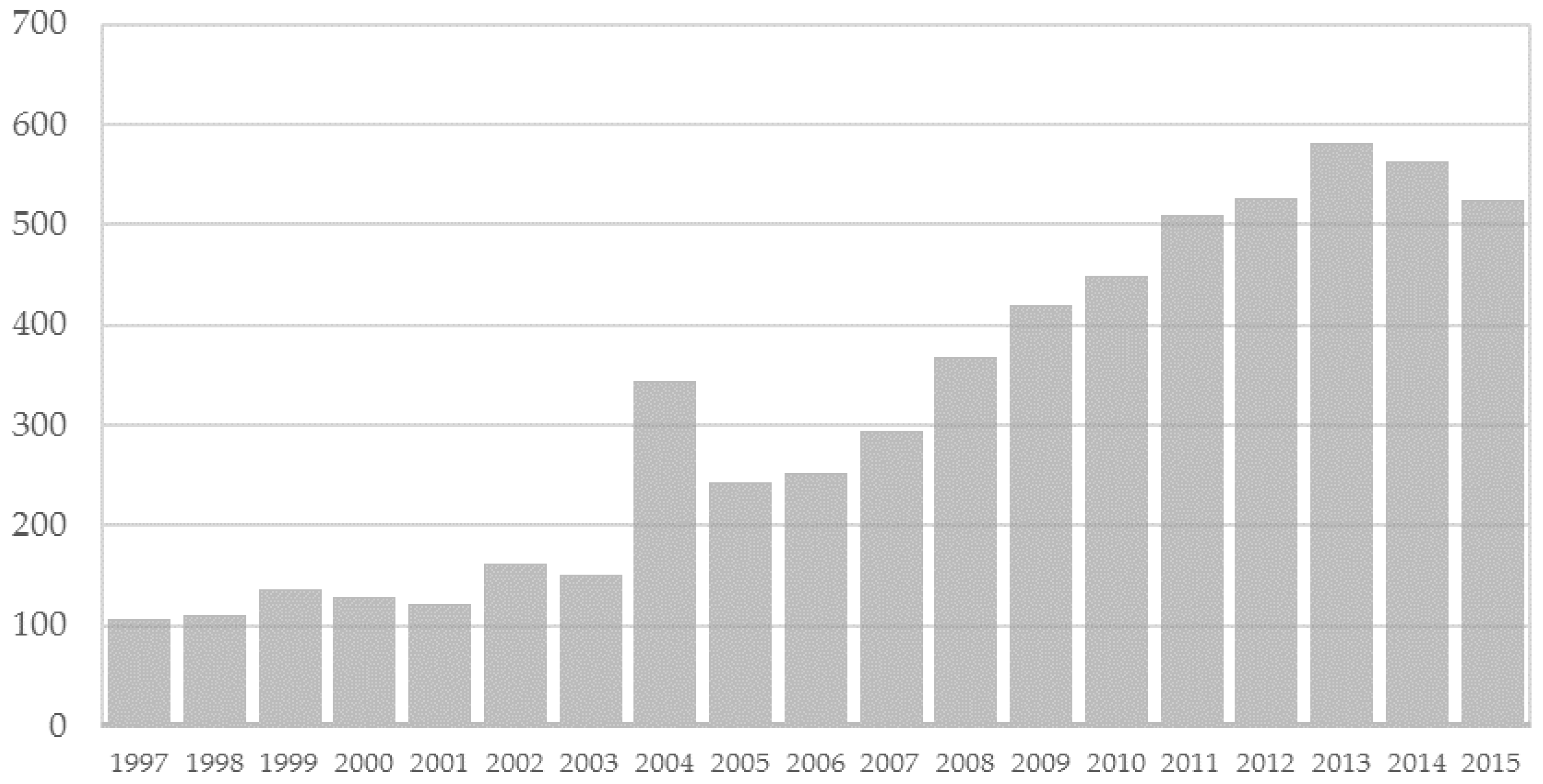 Kauffman and Mann [6] provide an outline of mainstream learning theories in healthcare education, which include adult learning principles, social cognitive theory, reflective practice, transformative learning, self-directed learning, experiential learning, situated learning, and learning in communities of practice. The current paper examines reflective practice in healthcare education, which was highlighted in the 1980s in seminal texts by Donald Schön [2,7] (mentioned above) and his well-known quote “inherent in the practice of the professionals we recognize as unusually competent, is a core of artistry” [7]. Reflective practice has become popular in the scientific literature, with more than 500 publications in 2014 and in 2015 (Figure 1). Numerous empirical studies have investigated various aspects of reflective practice in healthcare education. Researchers have also conducted extensive reviews, including several systematic reviews. In this context, a mapping of the literature via an umbrella review is needed.