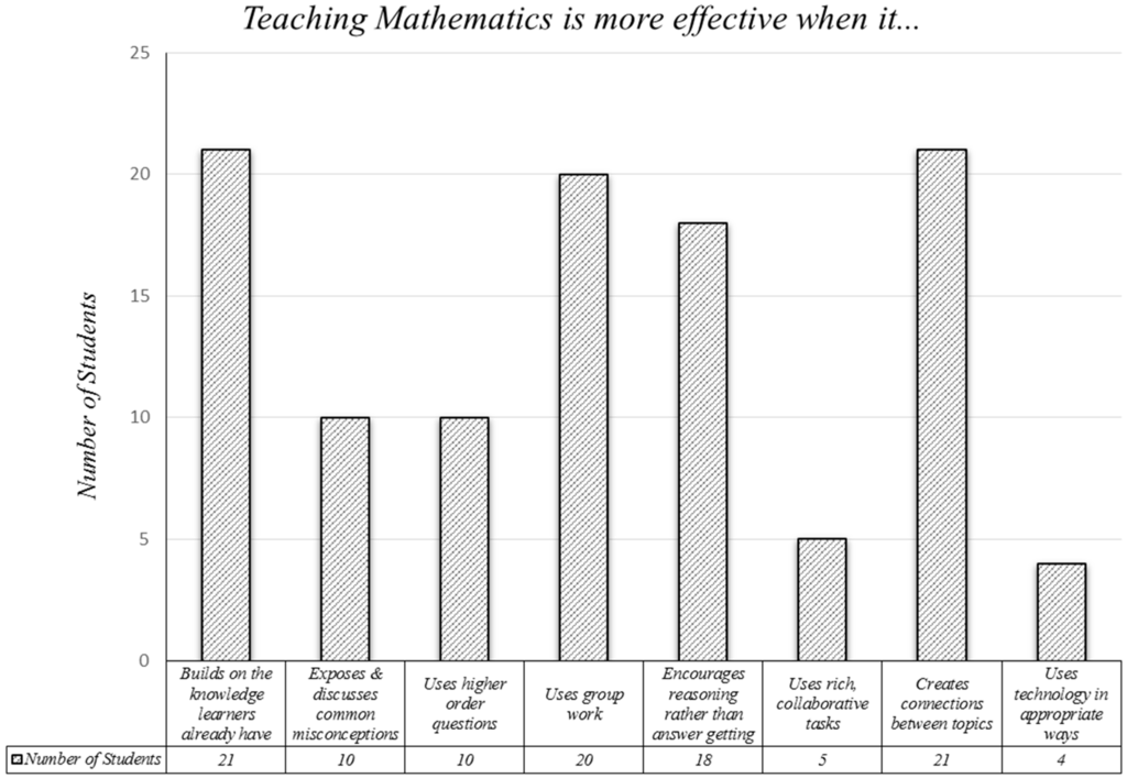 Figure 2 is a bar chart showing students responses about their perception of what contributes to the effectiveness of teaching mathematics. More than 86% of the students believed that teaching mathematics is more effective when it builds on previous knowledge, when it creates connections between topics and most importantly when it uses group work as a didactic approach. More than three quarters of the responses also referred to encouraging reasoning rather than simply getting an answer as another effective teaching strategy for mathematics.
