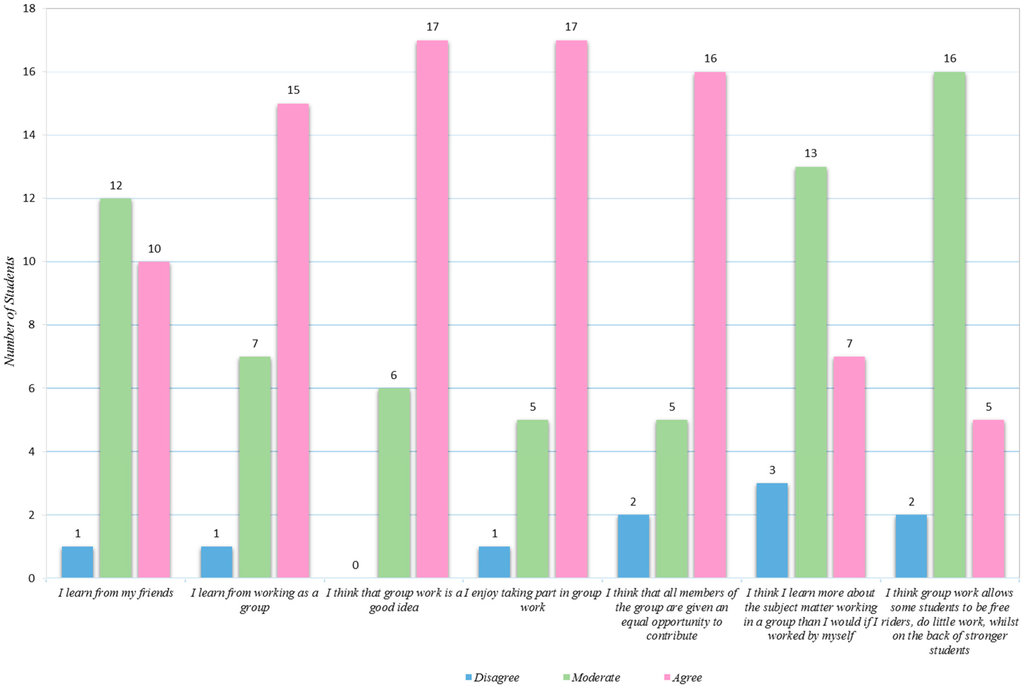 A questionnaire (see Appendix A) was administered on the experience of group work during the sessions, as well as an investigation into the exam results from the end of semester examinations. Students were invited to participate in the study, which was voluntary due to ethical considerations and involved completion of questionnaires, observations of collaborative activity with hand written observations made by the educator. The survey was administered only to the Experimental class, with all 23 students completing the questionnaires. Some questions required opinionated handwritten replies and the rest of the responses were sought on 3-point Likert scales ranging from “Disagree” to “Agree”.
