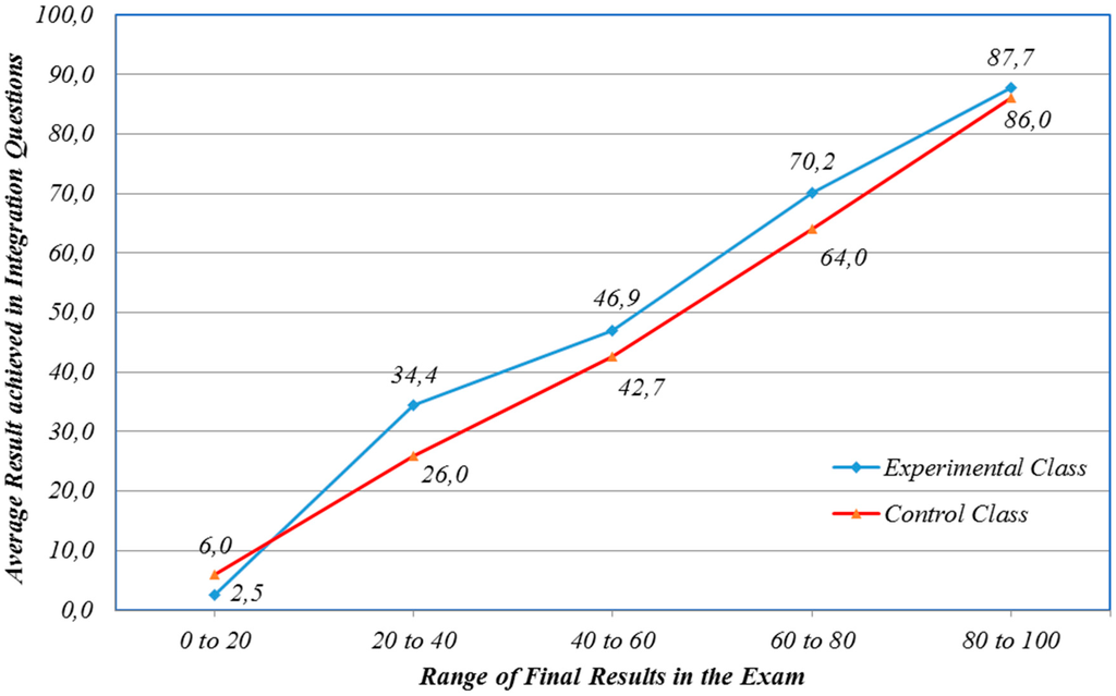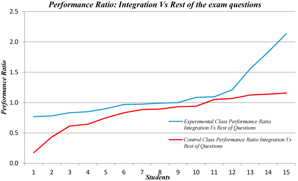 The analysis of these results indicate that, throughout the spectrum, the performance ratio values of students learning integration in the experimental class were always higher than those of the students of the control class, as can be seen by the blue line always having an upward trend above the red line. Hence, this figure clearly portrays and supports the benefits of group work on the topic of integration.
