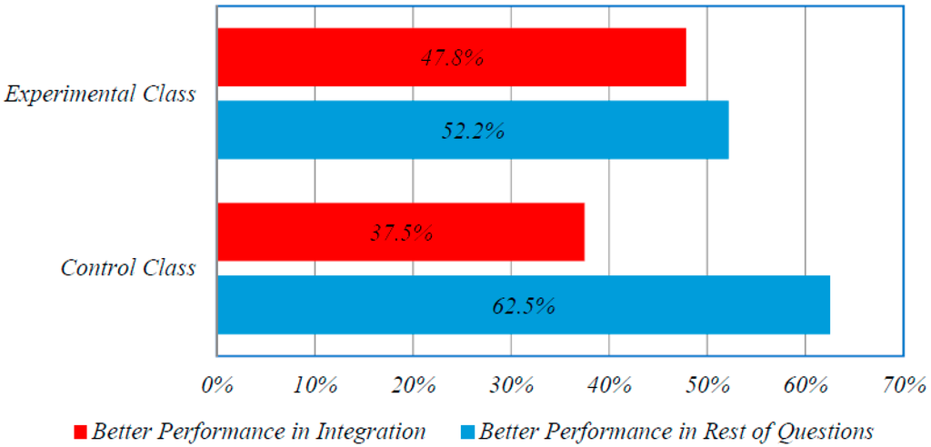 Percentage of students performing better in Integration questions vs. the rest of the exam questions for both the Experimental and Control class.