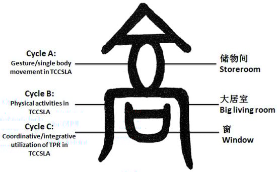 In scientific research, it is common to use forms of visual representations for theorizing, i.e., to work out and present analyses. In science, visual images contain and convey meanings. For instance, Shteir and Lightman demonstrate the use of images such as charts, diagrams, calendars, networks and photographs as vehicles for theorizing science itself []. Swedberg argues that it is possible to theorize using visuals such as pictures, sketches, and diagrams to summarize an existing theory, to develop one’s theorizing capabilities, and to generate new theoretical knowledge []. While undertaking her research in an English-only monolingual university, Gao (高) [] took the risk of using a Hanzi (汉字) —character) as a visual means to theorize the cycles in her study (Figure 1). Using her imagination, Gao worked with 高 to explore and depict her understanding of xingzhi (行知action/knowledge) research to capture features of its structure, movement, and forms. Thus, as a contribution to theorizing, Gao used Figure 1 to make explicit her understanding of the sequence of events in her research; their interrelationships and the path by which one influenced another. To understand Gao’s theorizing of her research process, readers have to directly engage this Hanzi which brings to the fore humans’ intellectual capabilities for theorizing in multimodal ways.