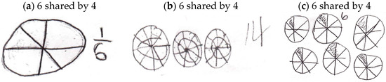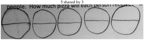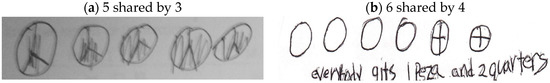 In some cases, children seemed to determine the number of whole pizzas each sharer should receive and partitioned the remaining pizzas to reflect the number of sharers. As shown in Figure 3b, the child drew six pizzas, but partitioned only the two pizzas that were left after dealing out one pizza to each sharer. The remaining pizzas were partitioned into the number of sharers. As with partitioning each item in a number of parts equal to that of the number of sharers, this way of reasoning could be reflective of the child’s emerging coordination of the creation of equal parts and exhausting the whole [13,15].
