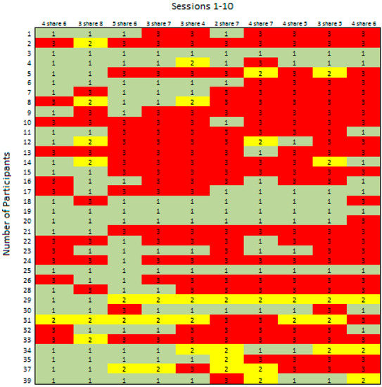 Heat maps showing ways of partitioning over ten sessions. Note: Participants 27, 36, 38, and 40 scored 3 on all session assessments.