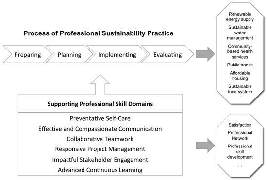 Overview of six professional skills domains relevant to sustainability practice and its outcomes.