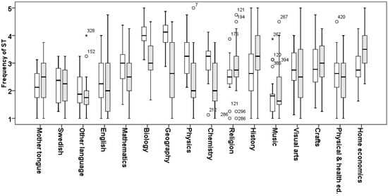 The frequency of ecological and economic ST of the different subject teachers. White bars = ecological sustainability; gray bars = economic sustainability. Boxplots show the median, interquartile range, outliers (circles), and extreme cases (stars) of individual variables.