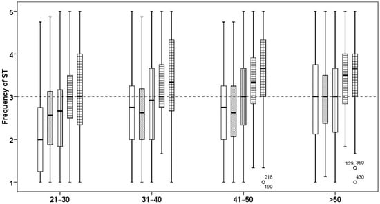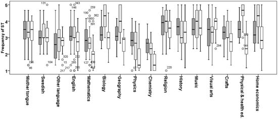 There seemed to be clear differences in teachers’ ST (Table 3, Figure 1 and Figure 2); thus, univariate analysis of variance (ANOVA) was used to determine which of the independent variables (age, subject of the teacher, or location of the school) were important (Table 4). To test the differences between the teachers, Levene’s test indicated that the variances between the teacher groups did not differ significantly (p > 0.05) from each other. The results show that the teacher’s subject was the most important factor explaining the frequency of ST, accounting 20%–43% of the variance (SS effect + SS error) (Table 4).