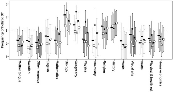The most interesting result of this study was that the teachers’ subject was the most important factor explaining their contribution in ST, their age being of only minor importance. Teachers’ gender, school, or the location in different types of residential areas did not explain the differences between the subject teachers’ perceptions. Teachers’ professional development was likely the reason for the finding that older teachers used more ST than younger teachers. In a Swedish study [] similar results were found; recently qualified teachers’ perceptions of SD indicated a poorer understanding of SD than teachers who had been working longer than five years. The results of these studies contradict a British study, which found that student teachers have a more comprehensive understanding of SD than their mentors, the experienced teachers [].