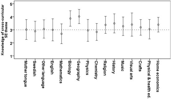 Teachers’ perceptions of their general competence in SE were assessed using five items by using a five-point Likert scale. On average, teachers rated their knowledge of the cross-curricular theme “Responsibility for the environment, wellbeing and sustainable future” satisfactory or higher (Figure 4). There were still differences between the teachers (one-way ANOVA, F = 4.1, df = 15, p < 0.001). For instance, biology and geography teachers’ responses indicated that their conceptions on their knowledge of the cross-curricular theme was higher than among most other subject teachers, especially physics, chemistry, mathematics, language, and physical and health education teachers (Tukey’s test, p < 0.05).