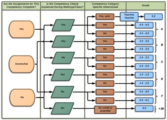 A dichotomous rubric (Figure 2) was the primary means of assigning grades, allowing for tiered assessment based on prioritization of student work and understanding. The rubric followed a mixed-scale model, measuring student outcomes through qualitative determinants and assigning them a quantitative value. This was done to have scores fall into a traditional A to F format to follow the school’s grading scale. The grades were not on assignments, as is typically the case with linear methods, but rather the competencies themselves. The competency a student chose was evaluated on the range and completeness of assignments, articulation of concept and then specific qualities depending on the nature of the competency, mostly focusing on how well students describe interconnections of a given competency to others.