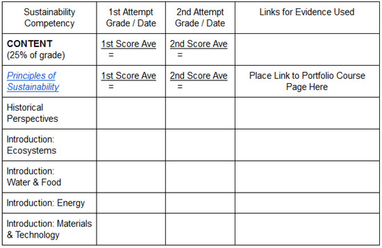 Student sustainability competency scorecard: This document tracked the growth and progress of individual student competency scores. Students were expected to maintain this scorecard, serving as a “checklist” to see what competencies had been attempted. The first column are the competencies themselves. The second column is the first score. This is where students placed the score of their first attempt at a competency. At the top of the column within each competency group students were to average scores together. The third column is the second score which allowed students to try the competency again if they were not satisfied with their first score. The fourth and final column has space to link work used to argue and defend their grade. Since assignments were multimedia, students were able place a digital link straight to the assignment(s) used for that competency.