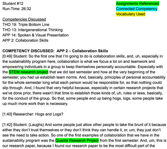 On the transcription heading, three colored labels make up the coding key. Green is “Assignments Referenced”, blue is “Connected Competency”, and yellow is “Vocabulary Used”. When these items occur in the transcription, the text was highlighted the appropriate color.