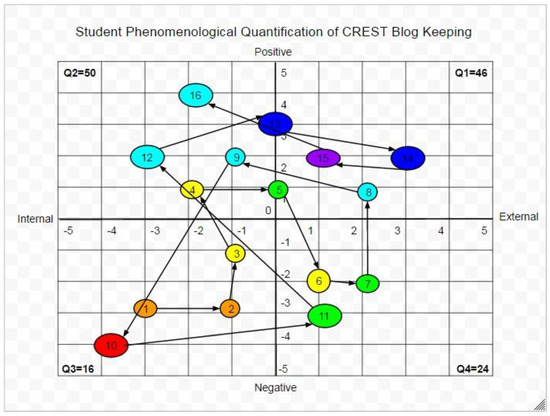 On the blog graphs, each blog post is chronologically numbered. This number gives each post more numerical weight than the one made before it and heavier value the later in the semester it was written. In Table 5, those numeric weights were added up for each student in each quadrant, and each student’s highest totaling quadrant (majority) is also indicated.
