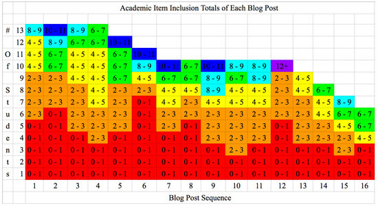Four of the five students who scored the highest grades (#4, #9, #10, #12, #13) were at or below 2.5 academic items per blog post. Conversely, the four of the five lowest students (#1, #2, #3, #8, #11) were nearly, at or well above 5 academic items per post, double that of the higher end students. The three students in the middle of score ranking (#5, #6, #7) were also in the middle for academic item inclusion.