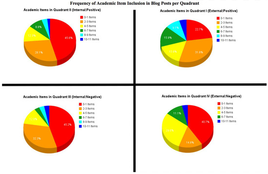 In Quadrant I, 86% of all posts ranged from 0–7 academic items. Whereas in the other quadrants, all of the posts only reached 0–5 items for about the same percentage. With this increase for Quadrant I, the model suggests that when students work with a positive outlook on the world, they could be more encouraged to use academic content covered in class.