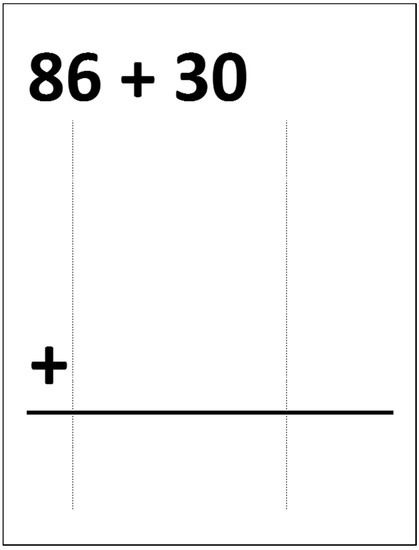 To structure the small group activity, the students were each given a 14-page workbook that contained all session problems, with one problem presented horizontally at the top of each page (e.g., “59 + 1”). In the workbook for the manipulatives-first condition, the first seven pages contained a problem written at the top, with nothing else on the page. These pages were used for the seven problems solved with the manipulatives. The next seven pages contained the same problems in the same order, one at the top of each page, but each problem was followed by dotted lines that separated the different place values as scaffolds for performing the standard algorithm (see Figure 2 for a sample page).