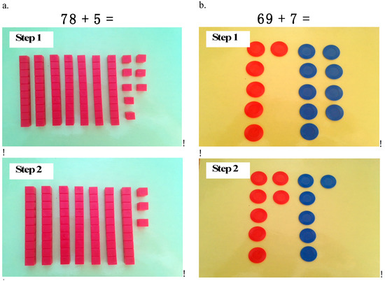 Two evaluation tasks were administered. Both tasks involved showing students photographs of the start and end of solutions to addition problems with regrouping by a fictitious child using blocks (for the Evaluation with Blocks task, or the EVB task; see Panel a in Figure 4) or chips (for the Evaluation with Chips task, or the EVC task; see Panel b in Figure 4). Students were required to indicate whether the solutions were correct or not, and to explain the child’s strategy. For the EVC task, the students were told the quantitative values for the different coloured chips (i.e., green chips were worth 100, red chips were worth 10, and blue chips were worth 1). The addition problems for the EVB task at pre-test were 37 + 4 (correctly solved) and 109 + 6 (incorrectly solved), and at post-test, they were 78 + 5 (incorrectly solved) and 208 + 4 (correctly solved). The addition problems for the EVC task at pre-test were 44 + 9 (incorrectly solved) and 246 + 70 (correctly solved), and 69 + 7 (correctly solved) and 393 + 30 (incorrectly solved) at post-test.