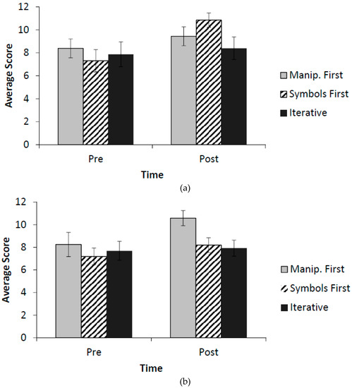 In yet other research, the benefits of alternating, or “iterating”, abstract and concrete representations have been demonstrated. Based on the development of conceptual and procedural knowledge (for a recent review, see Rittle-Johnson & Schneider, 2015) [29], Rittle-Johnson and Koedinger (2009) [9] compared the effects of lesson sequence on sixth-graders’ conceptual knowledge of place value and procedural knowledge in decimal arithmetic. Compared to a group who received all concepts lessons before the procedures lessons (“blocked” sequence), iterative sequencing resulted in better learning and transfer of procedural knowledge, but no difference was found between conditions on the transfer of place value concepts. The authors urged researchers to test the effects of iterative sequencing against both concepts-first and procedures-first orders, the latter not being included in their study.