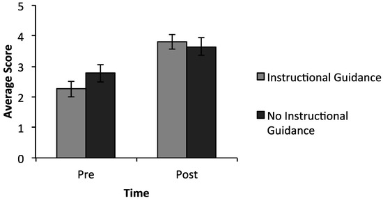 For the EVC task, we again conducted a 2 (time) × 3 (sequence) × 2 (guidance) ANOVA with the Evaluation with Chips (EVC) task as the dependent measure. The test revealed a main effect of time, F(1, 80) = 53.63, p < 0.001, partial η2 = 0.40 (pre: M = 2.51, SD = 1.80; post: M = 3.73, SD = 1.77), which must be interpreted in light of the significant time x guidance interaction, F(1, 80) = 4.44, p = 0.038, partial η2 = 0.05, presented graphically in Figure 6. Tests of simple effects demonstrated that both groups—those who received instructional guidance and those who did not, regardless of representation sequence—improved significantly on their ability to evaluate another student’s solution with chips from pre-test to post-test (without guidance, pre: M = 2.87, SD = 1.86; post: M = 3.64, SD = 1.87, p = 0.001; with guidance, pre: M = 2.26, SD = 1.72; post: M = 3.81, SD = 1.69; p < 0.001). The interaction was due to a larger improvement demonstrated by the students who received instructional guidance on the structural similarities between the two representations relative to those who did not. These findings are in line with what we had expected, but there was no interaction between instructional guidance and representational sequence.