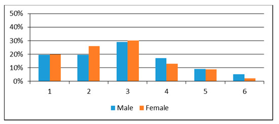 A comparison of female and male student teachers’ views about the relationship between species identification, biodiversity and sustainable development in six categories (1 = no answer; 2 = answers involving nonsense or cliché; 3 = answers involving partial relationships without systems thinking; 4 = answers involving interconnections; 5 = answers involving interconnections and feedback; 6 = answers involving interconnections, feedback and behavioural aspects). Note: Categories 7–10 were deleted from the figure because there were no answers in these categories.