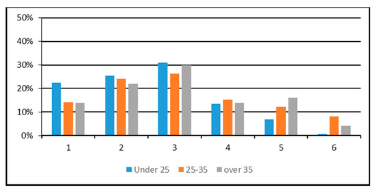 A comparison of student teachers’ views about the relationship between species identification, biodiversity and sustainable development in three age groups (<25; 25–35; >35) and six categories (1 = no answer; 2 = answers involving nonsense or cliché; 3 = answers involving partial relationships without systems thinking; 4 = answers involving interconnections; 5 = answers involving interconnections and feedback; 6 = answers involving interconnections, feedback and behavioural aspects). Note: Categories 7–10 were deleted from the figure because there were no answers in these categories.