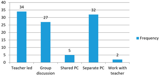 A frequency graph was developed to see if there were any trends in collaborative behaviour. Kali, Markauskaite, Goodyear and Ward [40] in their research into collaborative design process found four unique characteristic of the teams: multi-dimensional exploration; balanced process; mutual respect, and; crossed domain expertise. The authors suggest that these principles can be used to guide the design process. Building on these principles, we examined how the groups actually organised their collaborations. As can be seen in Figure 1, of the majority of recorded activities 34 per cent were the teacher-led activities. These occurred at the start of each class.