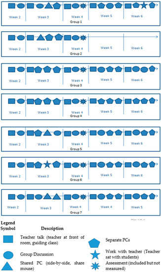 What the results suggest is that the teacher-led activity at the start of each class was used to orient the groups. Some groups followed the teacher activity with a discussion. For instance, each week, Group 7 had a discussion after the teacher activity. We argue that the issue is not whether to scaffold the collaboration and the task, but when and how to scaffold [42]. That is, a degree of scaffolding or guidance is needed to both aspects (collaboration and task), but allowing students to engage with a task without presenting a guided step-by-step task may encourage the activation of non-domain-specific knowledge and recognition of gaps in knowledge. This deeper understanding of the task increases the domain knowledge and problem-solving skills. Enabling students to struggle or make mistakes is often shied away from in education, but as Kolodner [43] suggested, timely feedback and opportunities to re-engage with the task can afford learners with greater opportunities to learn and interpret their experiences.