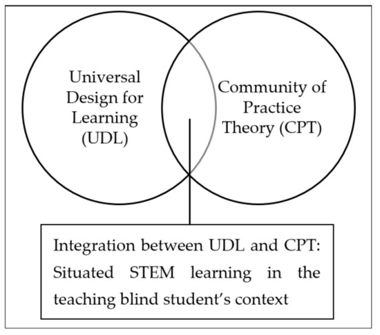 We argue that teaching blind students in STEM will require a situated learning context [15], for which reason we developed our conceptual framework based on the integration of two theoretical paradigms: the universal design for learning (UDL) [16] and the community of practice theory (CPT) [17,18] approaches. Therefore, we propose the iterative relationships between CPT and UDL for blind-accessible STEM education (Figure 1), which we will now explain.