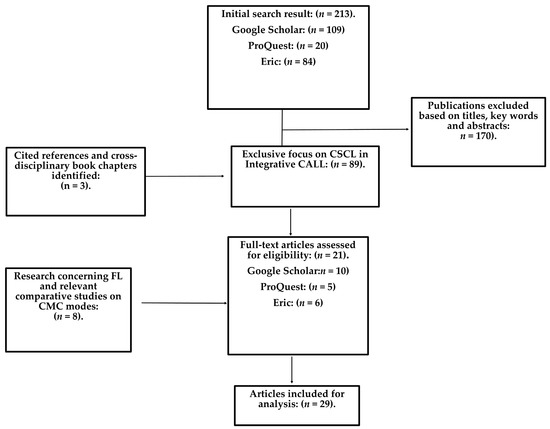 The first stage was carried out in databases using a combination of key words. In the initial search, summaries, conference abstracts and commentaries were excluded; and at second stage the investigator focused exclusively on the integrative CALL in order to maintain a social interactionist approach. The majority of studies included in this phase looked into communicative practices and authentic discourse from sociocognitive perspective and took CSCL principally as Agency. To minimize publication and language bias, cited references and cross-disciplinary book chapters were also rated for inclusion criteria, but duplicated research deigns were excluded. Additionally, results drawn from comparative studies on synchronous and asynchronous CMC were found relevant in this review. To narrow down on the retrieved papers, inclusion of exact phrases (CoPs, online L2 identities, social presence, oral proficiency, Internet interest community) were paired with initial reference lists. It should be clarified that in this review organizational competence and quality of online learning experience were the main investigation. Based on the investigator’s prior knowledge, previous studies seemed to agree upon the facilitative role of text-based chat in learners’ writing skills and also argued for its possible transfer of skills to oral competence [14,15,16]. To examine the effect of written CMC on grammaticality and turn adjacency and provide plausible explanations, comparative studies looking into written CMC and results concerned with moderating variables such as interactional pattern (e.g., dyad, groupware), treatment length, socio-cultural and individual factors, etc. were also included for analysis.