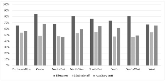 A further analysis of the parents‘ views regarding the adequacy of the workforce in childcare settings revealed significant differences between administrative regions per type of personnel: Higher levels of positive appreciations concerning the number of educators characterized parents from the Centre region, the North-West, and the South-West regions, while the lowest levels of positive feedback characterized the responses of parents from the North-East and West regions. The medical staff (nurses) and the auxiliary staff recorded lower levels of positive opinions, compared with those mentioned for education. Parents from the South-East and West regions, and those from the Centre and the West regions, had the highest levels of satisfaction regarding the number of medical and auxiliary staff, respectively (see Figure 1).