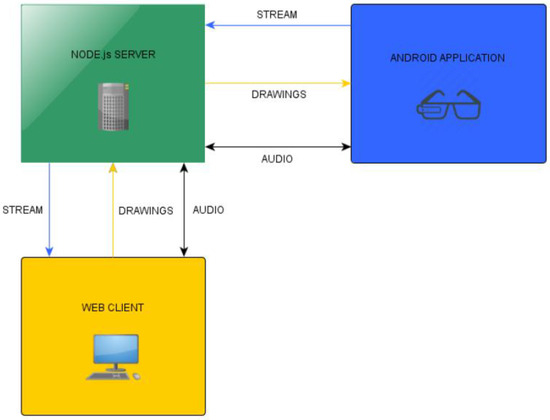 We implemented an Android-based [12] prototype for the smart glasses Vuzix M100 [13]. Additionally, a web-based prototype was implemented acting as server. Figure 1 shows the system architecture and the data flow. The instructor is using the web client which shows the live video stream of the smart glasses camera. Additionally, the audio of the instructor as well as the audio of the subject is transmitted. The server is responsible to transmit the WebRTC data stream to the web client and to the smart glasses Android app. WebRTC is a real-time communications framework for browsers, mobile platforms and IoT devices [8]. With this framework, audio, video and custom data (in our case: drawn shapes) are transmitted in real-time. This framework is used for both, the server and in the client Android application. Figure 1 shows the system architecture and infrastructure. All communication is transferred and managed by a NodeJS [14] server.