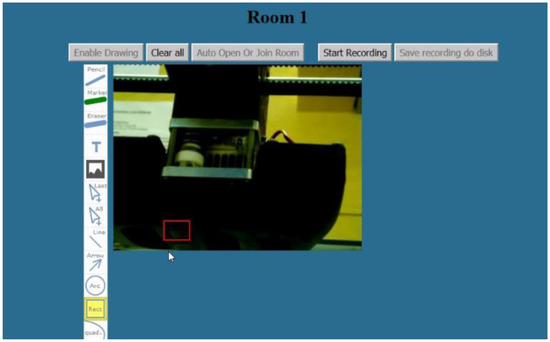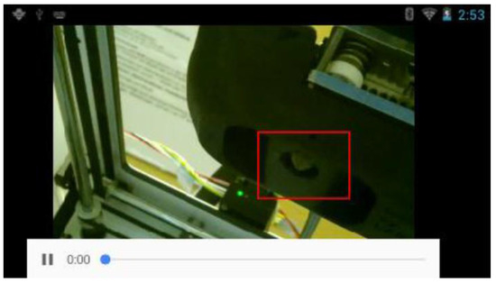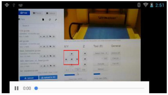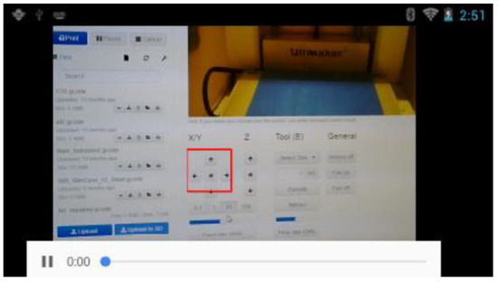 When the user selects the first option, a video stream of his own point of view (the video stream of the camera of the smart glasses) is shown. Additionally, drawn objects of the web application user (instructor) are displayed in real-time. This is very helpful when the subject investigates a complicated UI or machine. Then the instructor can guide the subject with drawn arrows or rectangles to the correct direction to perform the maintenance or fine-motor-skills task correctly. Figure 9 shows the 3D printer maintenance UI. Since the subject has never used the UI before, he/she needs guidance on how to use the UI. The highlighted area (red rectangle) shows the buttons which must be used for the maintenance procedure. Along with audio instructions, the subject in our evaluation managed to perform the maintenance task efficiently. The maintenance task will be explained in detail in Section 3.2.