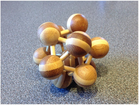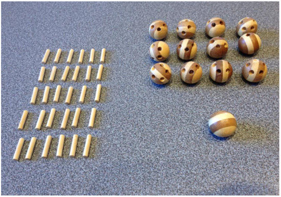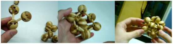 Since a lot of tasks can be separated into smaller fine-motor-skills tasks, the first approach was to evaluate our solution with such a task. We chose a wooden toy which reflects an assembly task. The subject gets the wooden parts and must assemble the toy without a manual or pictures of the finished assembly. Only by getting voice assistance and augmentation of the video stream with drawings, the subject must assemble the toy. The toy consists of 30 small wooden sticks, 12 wooden spheres with five holes each and one sphere without any holes. Figure 10 shows the parts of the toy.