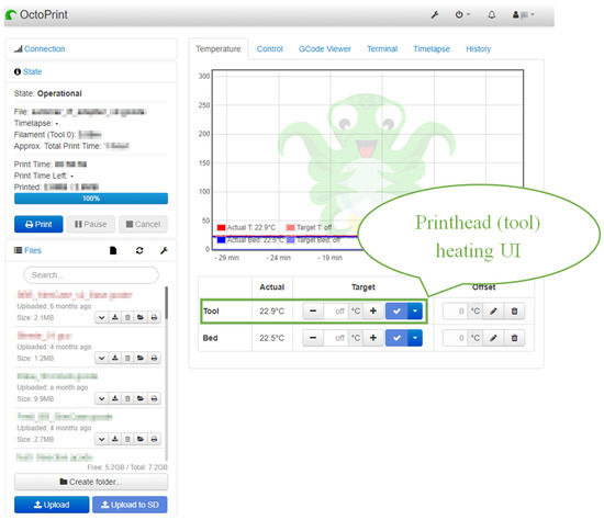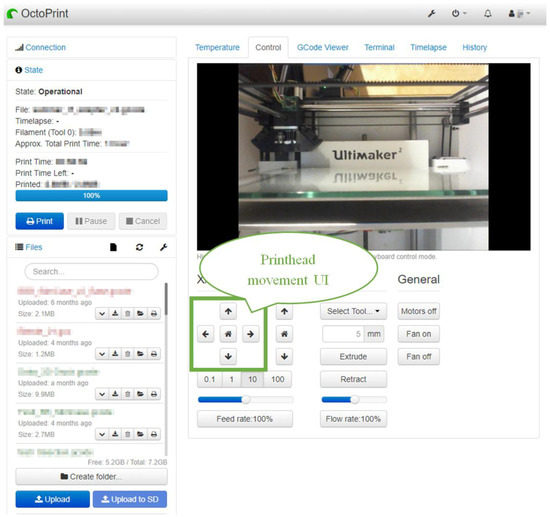 The heating and cooling of the printhead can be achieved by using a web-based UI of the 3D printer. Additionally, users can move the printhead by pressing position adjust buttons in the 3D printer web UI. Our 3D printer uses the Web UI provided by OctoPrint [31]. Two screens are necessary to perform the maintenance operation. Figure 12 shows the printhead movement UI. The arrows indicate the movement directions. The area of interest is marked with a green frame and a speech balloon.