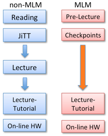 For the non-MLM group, an instructor-led passive lecture session lasting between 45–50 min was incorporated. This lecture served as a more traditional introduction to material and in many ways was similar to the pre-lectures viewed by the MLM group, with the main exceptions being the lack of multimedia content. This added lecture session resulted in greater time-on-task for students that did complete the reading within the non-MLM group compared to the MLM group. Less content outside of the area of electromagnetism was covered during the non-MLM semesters to compensate for the added instructional time.
