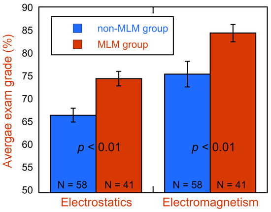 Figure 3 shows the average exam grade for the MLM and non-MLM groups for exams on electrostatics and electromagnetism. For the electrostatics exam, the non-MLM group had an average of while the MLM group had an average of . For the electromagnetism exam, the non-MLM group had an average of while the MLM group had an average of . A one-tail un-paired t-test was used to determine whether or not the means of the two populations were equal. The MLM group had a significantly greater exam average for both exams compared to the non-MLM group valid at the p < 1% level. We found no statistical difference between exam grades when comparing between the two semesters of MLM and non-MLM instruction, which suggests the use of two different exams had little effect with respect to the average exam grade. There were also no measurable between-group differences with respect to content knowledge as measured by the CSEM (as discussed in the previous section).