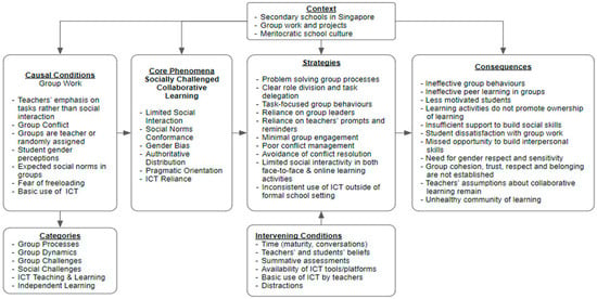 The central phenomenon identified in this research was socially challenged collaborative learning of secondary students in Singapore as shown in Figure 1. While there was a strong belief in the benefits of collaborative learning among the students, the strength of their dissatisfaction suggested a socially challenging learning environment. Their narratives pointed to insufficient attention to social–emotional aspects or assumptions that social interactions would naturally occur. Numerous researchers had highlighted that when groups failed, the failures were often at the social rather than the technical level [22,23,24]. The “social challenges in collaborative learning” phenomenon could, therefore, likely be explained by the unconscious, unquestioned acceptance that collaborative learning automatically would lead to better pedagogical outcomes.