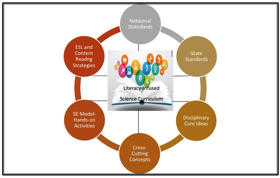 - Our findings for ELs and EC students indicate that the PD and lesson plans were successful for promoting literacy-infused science via a 5E model that includes three to five of the Es used daily as opposed to using such practices with one to two Es per day, as is usually practiced. Big ideas were able to be conveyed and assessed through the project curriculum, literacy-infused science with the components depicted as a summary of our project in Figure 3: (a) national standards; (b) state standards; (c) DCIs; (d) 5E Model and hands-on activities; and (e) ESL and content reading strategies.