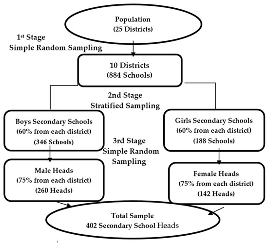 As the population was extensively scattered, it was not possible to select a sample through simple random sampling technique. Therefore, multistage sampling technique was adopted by the researchers for selecting sample. At the first stage, 10 (40%) out of 25 districts of Khyber Pakhtunkhwa i.e., Kohat, Karak, Bannu, Peshawar, Nowshera, Abbottabad, Charssada, Lakki Marwat, Hangu, and Malakand were selected randomly as a primary sampling unit. At the second stage, 60% boys’ and 60% girls’ secondary schools were selected through stratified sampling technique as secondary sampling unit. At the third stage, 75% male and 75% female heads were selected randomly as a tertiary sampling unit. In this way, the total sample comprised of 402 secondary-school heads in which 260 were males and 142 were females. The step-by-step multistage sampling procedure was explained in Figure 1. The detail of the population and sample size is given in the Table 1 as under: