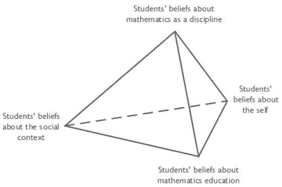 Students’ mathematics-related beliefs as made up by a basis of their beliefs about mathematics education, the social context and the self (triangle) [4], and their beliefs about mathematics as a discipline (the point above the triangle resulting in a tetrahedron) [5].