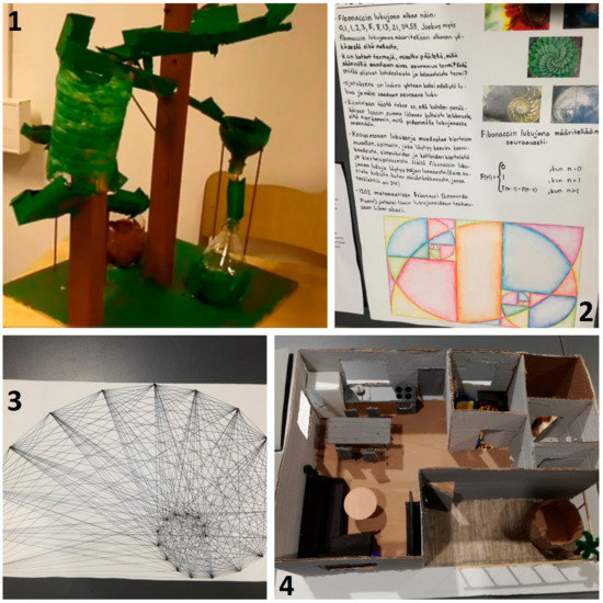 Figure 1 shows some examples of the final products. The marble ball game in the first picture is included in the project Ball path. Pictures 2 and 3 are both parts of the project work on the Fibonacci sequence. The final product includes a poster and a painting. In the fourth picture, there is a miniature of a house.