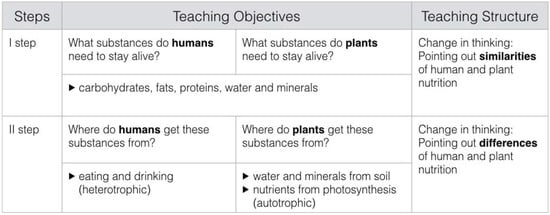 In the second part of the teaching unit, it is now possible to confront students with their own conceptions using the van-Helmont experiment. The preconditions to create a conceptual conflict are provided [32]. In this particular context, water and minerals do not suffice anymore to explain the plant’s growth. Consequently, there has to be a different way to acquire high-energy nutrients. Here the differences between human and plant nutrition have to be pointed out. Whereas humans are heterotrophic by consuming other organisms, the idea of plants as food producers can be introduced. After the teaching unit, plants should be seen as food-taking organisms as far as water and mineral consumption is concerned and, more of importance, food-producing organisms in regard to high-energy nutrients (see Figure 2).