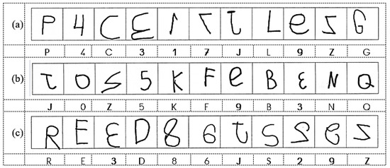 Writings of a series of dictated characters by (a) a boy aged 5 years 3 months, (b) a girl aged 6 years 2 months, and (c) a boy aged 5 years 8 months; all of them spontaneously wrote with their right hand (data from [35], Expt 2). (The mirror-reversed characters are shown in bold below the child’s writings).