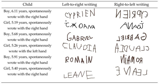 Name writings as a function of writing direction by a sample of six children (data from [35,43]). (Written informed consent to publish name writings was obtained from each child’s legal guardian).