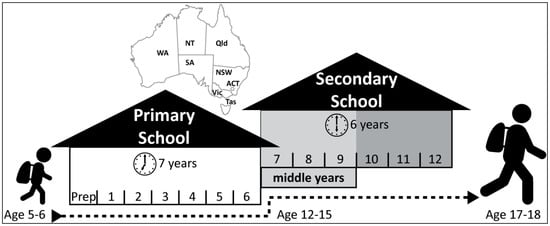 The Australian education system has a variety of school structures, determined by the eight states and territories that are each responsible for their respective education system. In general, schooling is two-tiered with students attending school from around age 5 or 6, through to age 17 or 18, see Figure 1. Students undertake seven years typically in a primary school setting, with a preparatory year through to the end of Year 6. Students then move to a secondary school, which extends for six years, from Year 7 to Year 12. Increasingly, there is a trend towards identifying the middle years as a separate tier, sometimes in a separate school, covering Years 7 to 9, with students aged from 12 to 15 years. This is the age group of interest in this paper.