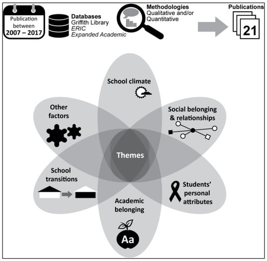 As presented in Figure 2, the review of the 21 articles generated six broad and overlapping themes associated with middle level students’ SOBAS, namely: (a) School climate; (b) social belonging and relationships; (c) students’ personal attributes; (d) academic belonging; (e) School transitions; and (f) other factors (e.g., gender, socio-economic status). Each of these themes will now be explored in turn to demonstrate the multidimensionality of the construct of SOBAS in the middle years.